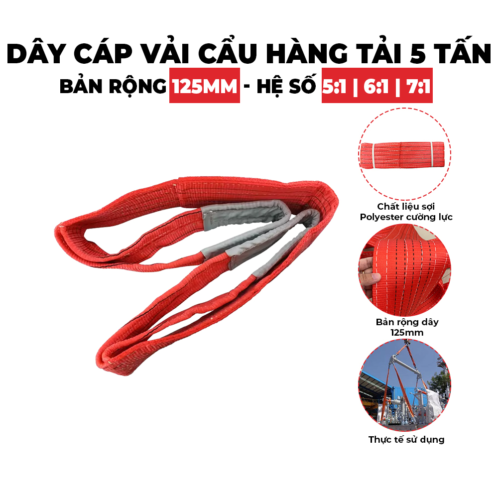 Sản phẩm dây cáp vải 5 tấn được may từ các sợi Polyester, chịu được tải làm việc lớn, độ bền cao phù hợp với các loại môi trường làm việc khắc nghiệt nhưng vẫn giúp người sử dụng đảm bảo được hiệu suất công việc và an tâm về độ an toàn trong lao động.